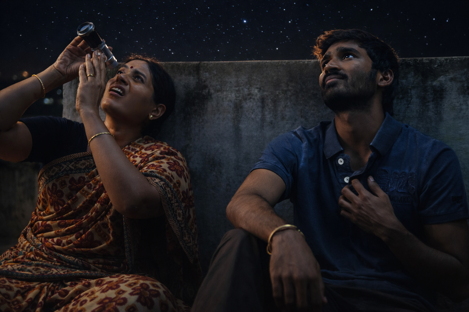 telescope towards sky. And I sits next to her, gazing upwards with his hand on his chest,